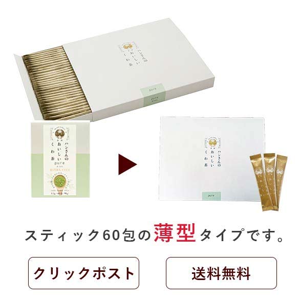 ハンさんのおいしいくわ茶 ピュアパウダー スティック60包の薄型タイプ。 何も加えずそのままの山梨県産桑100%。 個包装で利便性も抜群! レギュラータイプに比べてポストに投函できる薄型タイプのためお安くお買い求めいただけます。