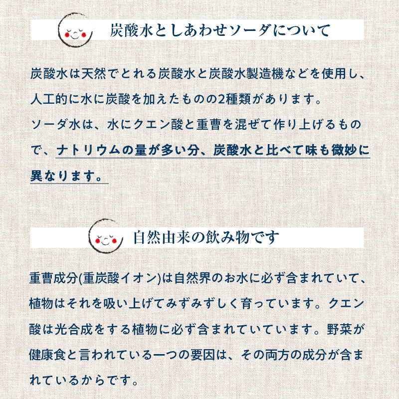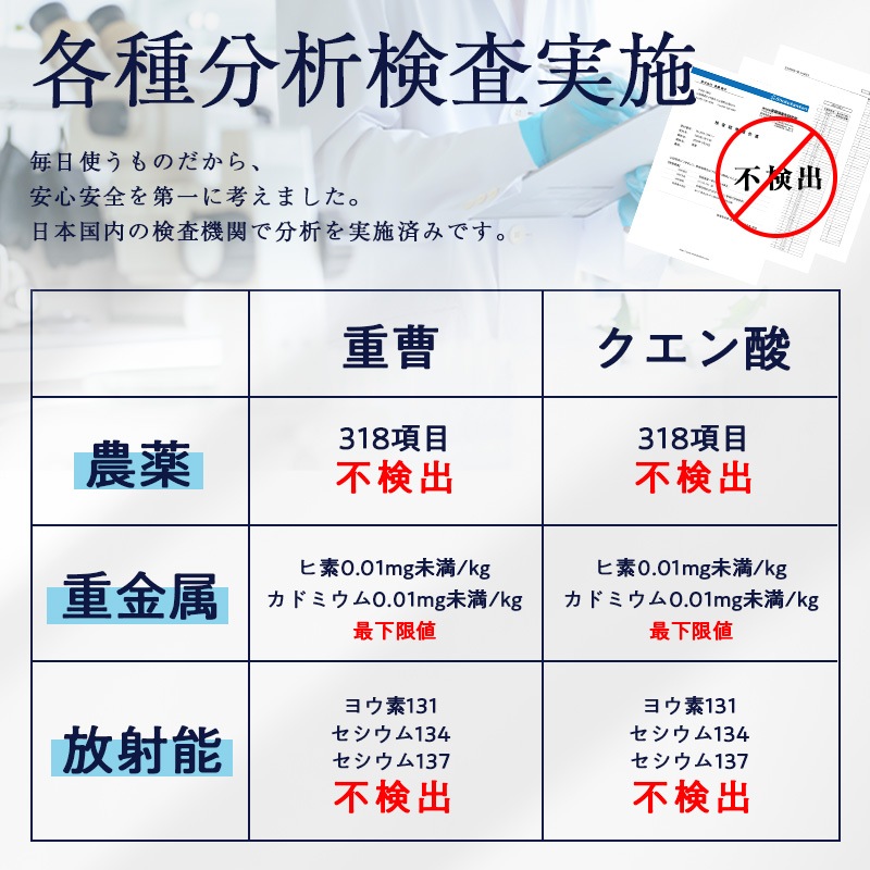 炭酸水素ナトリウム(アメリカコロラド州)、無水クエン酸(ヨーロッパ産とうもろこしと砂糖大根、オーストリア製造)