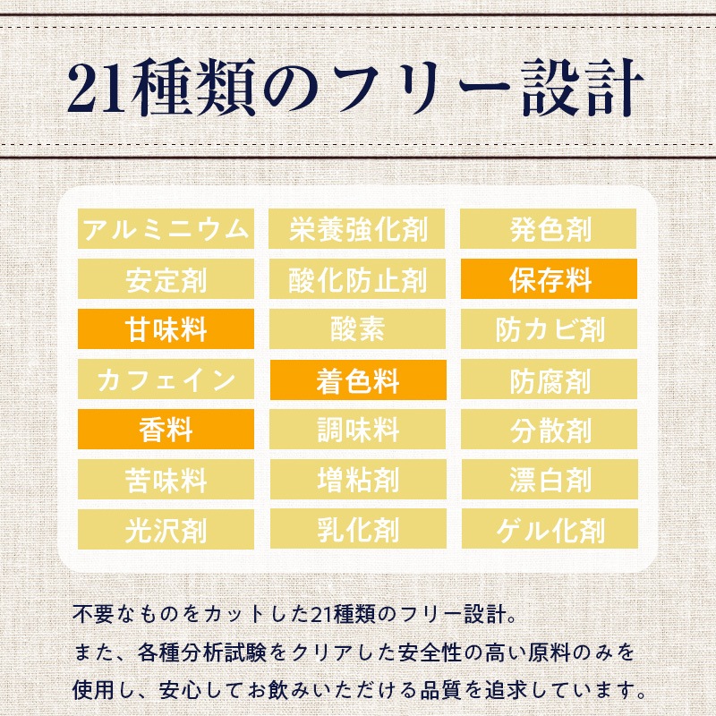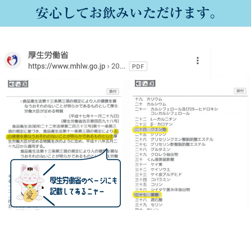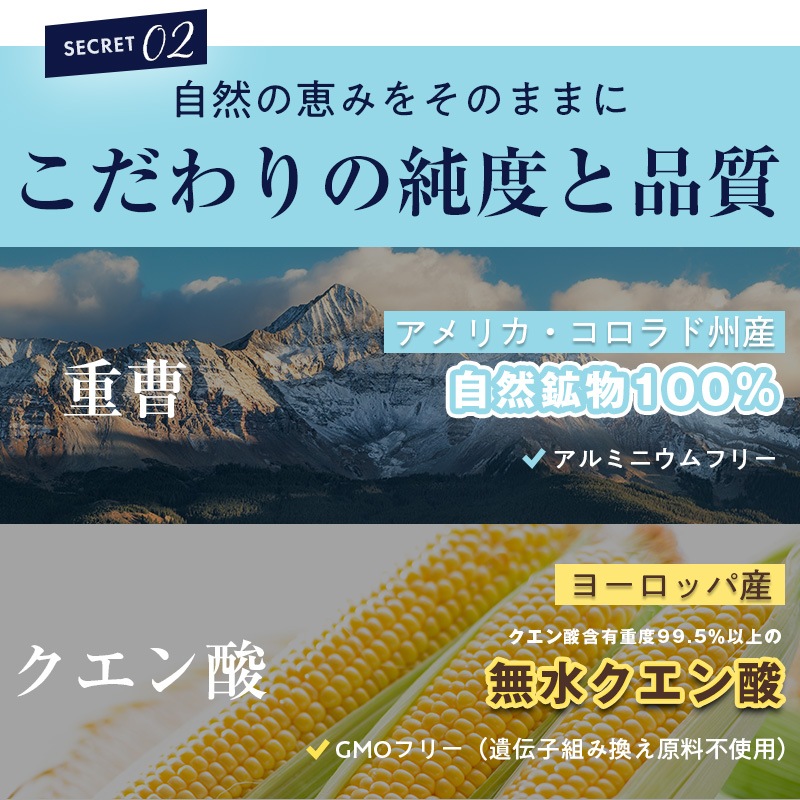 炭酸水素ナトリウム(アメリカコロラド州)、無水クエン酸(ヨーロッパ産とうもろこしと砂糖大根、オーストリア製造)
