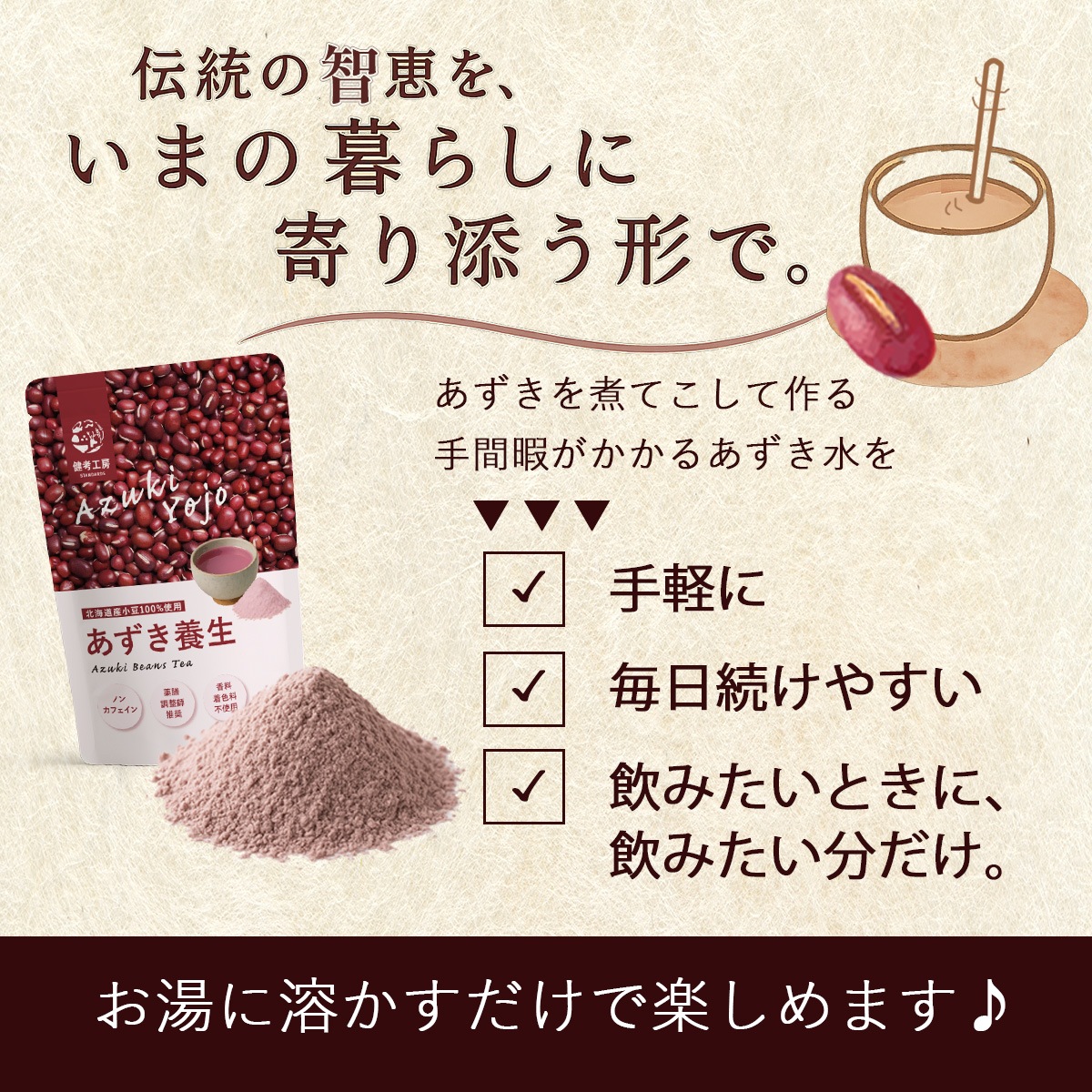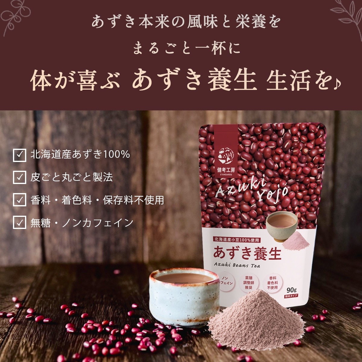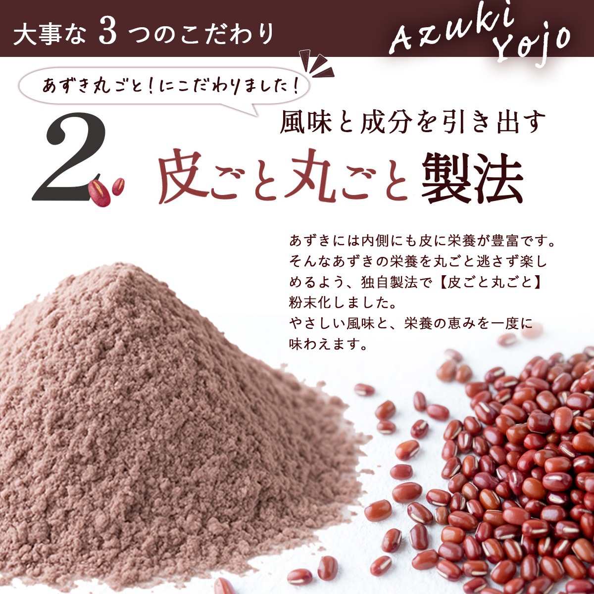 北海道産あずきを100%使用し、皮ごとまるごと粉末化。