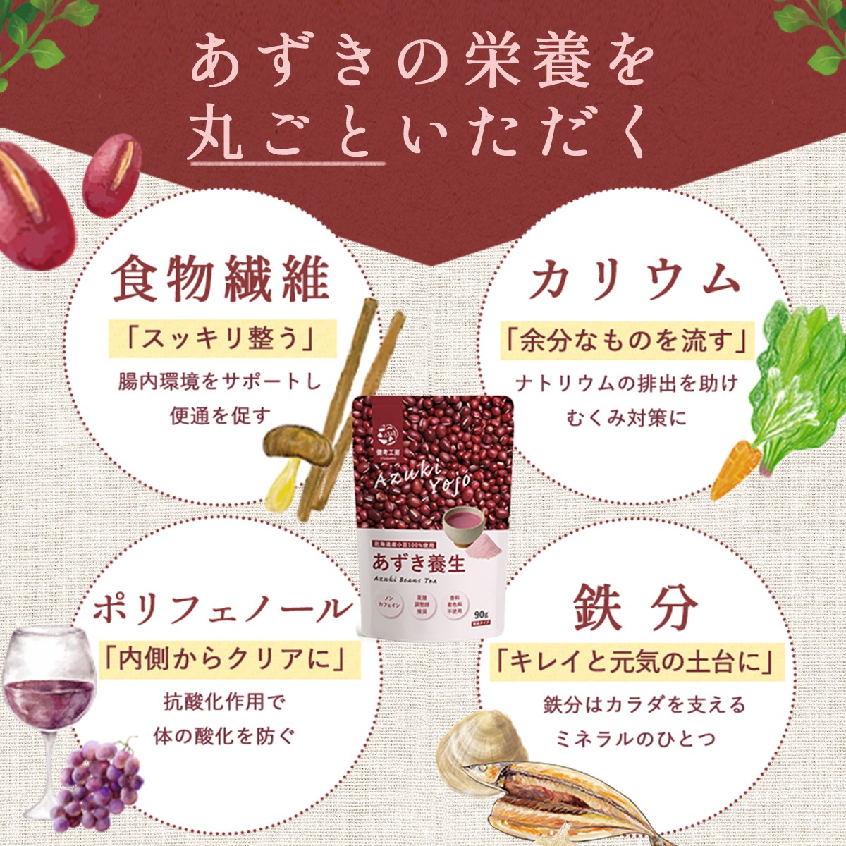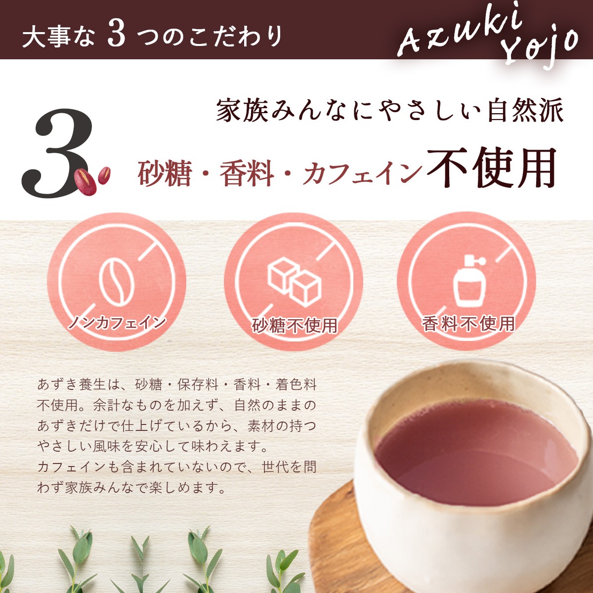 ポリフェノールや食物繊維、サポニン、カリウムなどの栄養を逃さず一杯に詰め込みました。砂糖・保存料・香料・着色料は不使用、ノンカフェインで安心。